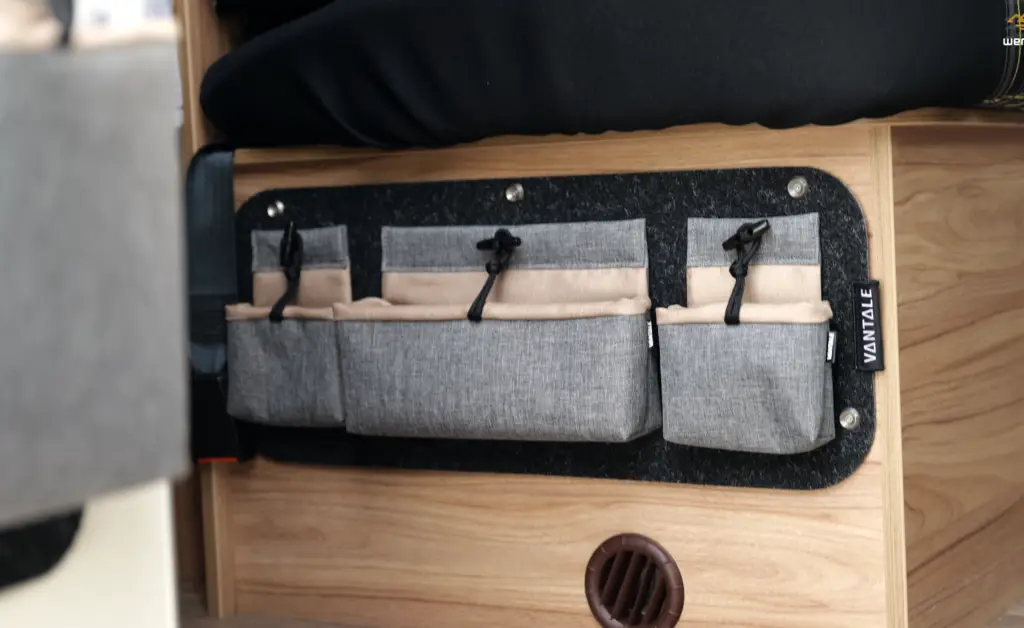 Im Eingangsbereich habe ich die serienmäßige Tasche von Hymer durch praktische Taschen von Ventil ersetzt. Sie sind nicht nur stylischer, sondern bieten auch mehr Platz und sind besser verarbeitet.