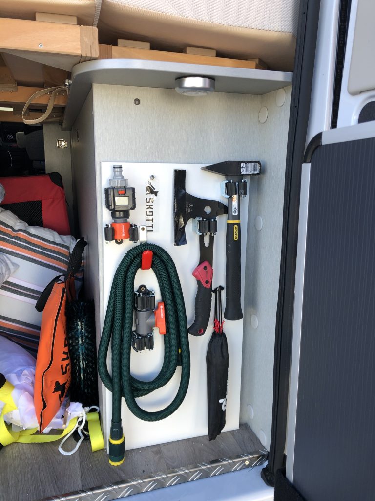 Ist das Brett erstmal fixiert, lassen sich die Gerätehalter auch schon anschrauben, und man kann alles an seinem neuen festen Platz unterbringen. Das alles dauert keine 20min. Und alles ist schnell greifbar.
