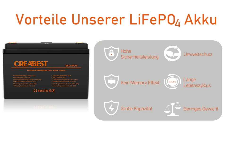 Anbieten tut sich hier zum Beispiel diese 172AH Batterie von CREABEST. Sie ist mit einem Bluetooth Modul versehen und lässt sich so jederzeit gut überwachen. Es gibt auch eine Version mit 258AH, womit Dein Beifahrersitz zu einem wahren Kraftwerk wird. Natürlich gibt es uch diverse andere Formfaktoren. Schau doch mal bei CREABEST auf der Seite nach den verschiedenen Modellen