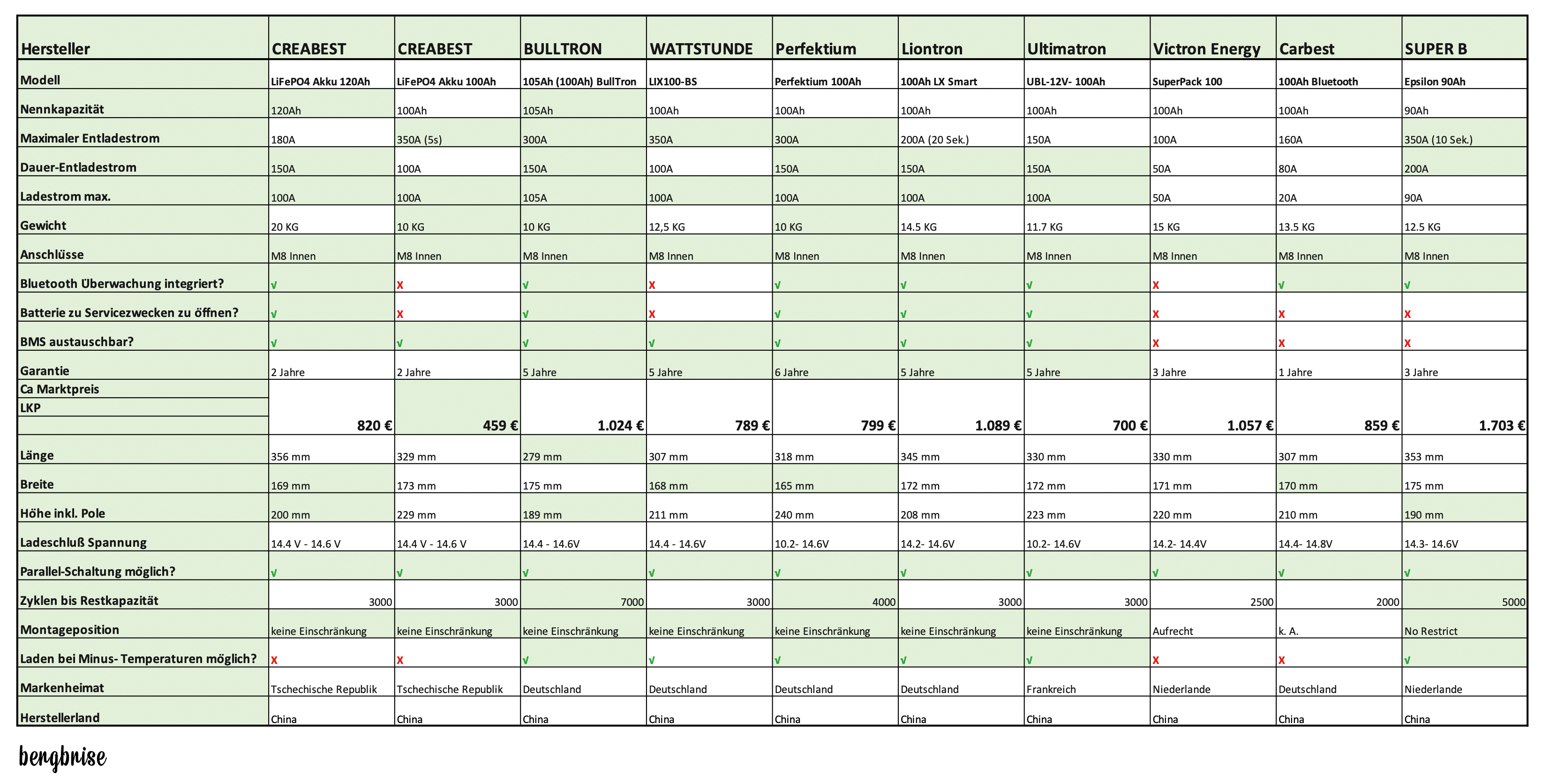 In meiner Übersicht (ohne Anspruch auf Vollständigkeit, und nur nach bestem Wissen und Gewissen ausgefüllt) findet Ihr den Vergleich der Batterien der Hersteller CREATBEST, Bulltron, WATTSTUNDE, Perfektium, Liontron, Ultimatron, Victron Energy, Carbest und SUPER B