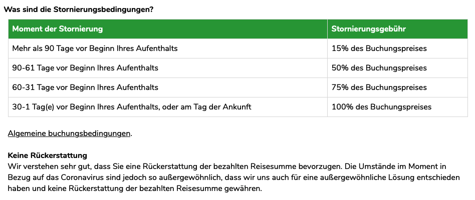 Die Antwort auf meine Stornierung kam schnell: Gerne wird storniert, auch wenn man es nicht verstehe, warum ich nun stornieren wolle, der Park sei schliesslcih geöffnet (ich denke, es ist noch immer meine Entscheidung, ob ich eine Reise antrete oder nicht…). An die im Web veröffentlichten Stornierungsbedingungen wolle man sich aber nun nicht mehr halten, da man „aufgrund der außergewöhnlichen Umstände“ einfach al so entschieden habe, dass man keine Anzahlungen zurückzahlt.