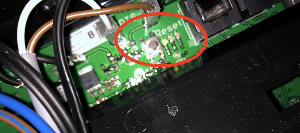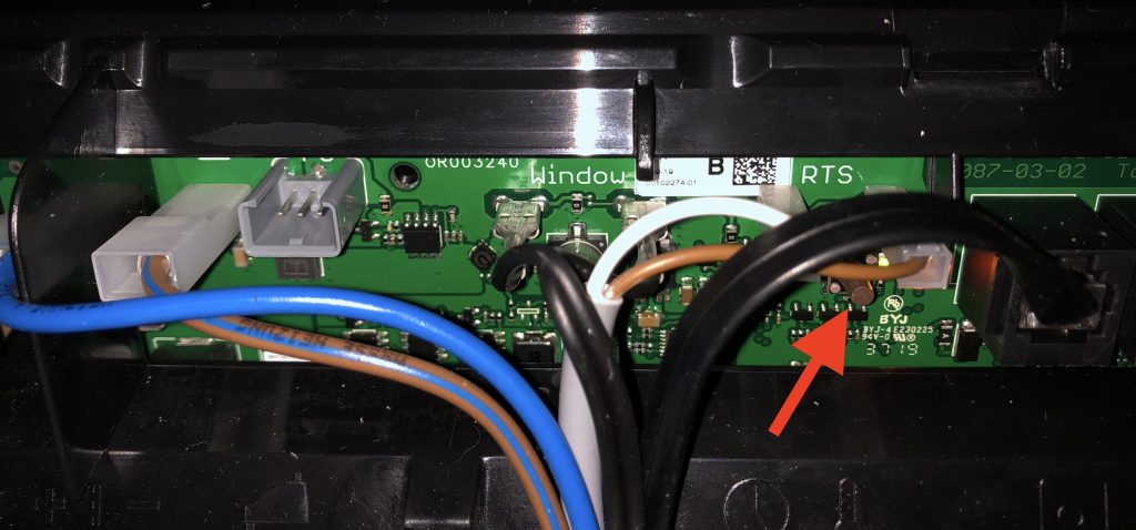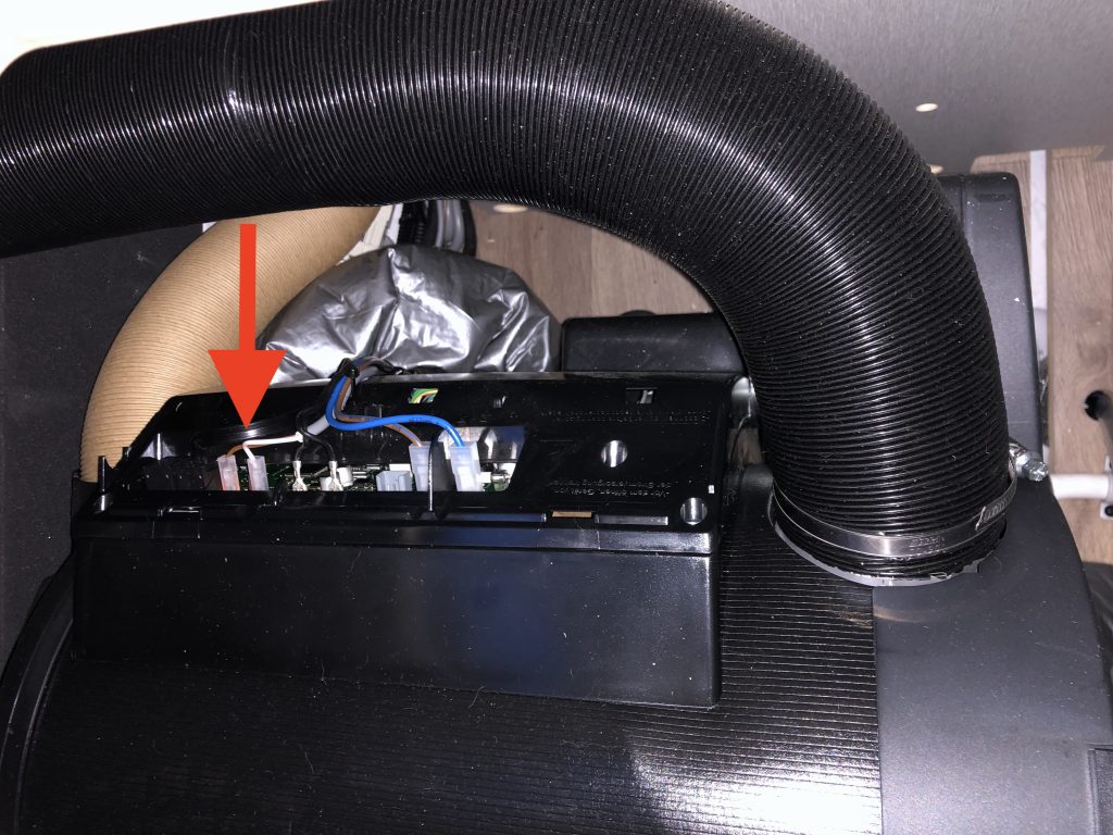 Zunächst mal muss das Sitzkissen der Sitzbank entfernt werden – in der Regel ist die TRUMA darunter verbaut. Service-Klappe auf und man findet die Heizung. Diese hat eine kleine Plastikhaube die man einfach nach oben abziehen kann. Darunter befindet sich die Steuerungselektronik der Combi 4. Dort wo ein LED leuchtet (oder vermutlich rot blinkt) befindet sich in unmittelbarer Nähe der RESET Taster. Ein kleiner, windig aussehender aufgelöteter Taster.